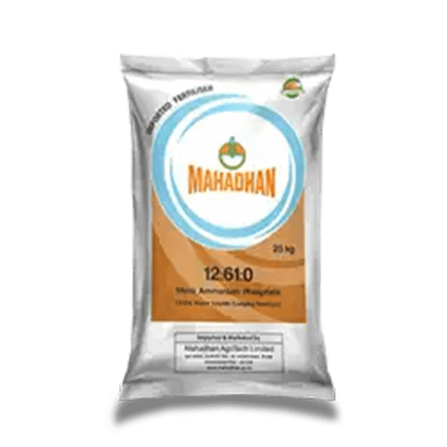 Foliar Spray: Mix 5 grams of Mahadhan 12:61:00 per liter of water. Apply 750 grams per acre using a 15-liter pump.