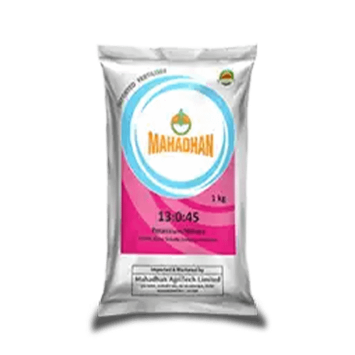Mahadhan 13:0:45 (Potassium Nitrate) is a high-performance, water-soluble fertilizer delivering 13% Nitrogen and 45% Potassium. It boosts flowering and fruit setting, enhances fruit size, color, and taste, and strengthens plants against stress and disease. Suitable for drip irrigation and foliar spray, it ensures rapid absorption and visible results.