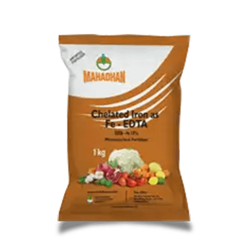Mahadhan Fe-EDTA is a high-quality chelated iron fertilizer containing 12% Fe in EDTA form, specially designed to correct iron deficiencies in crops. It promotes healthy green foliage, boosts photosynthesis, and enhances overall plant vigor. Suitable for foliar spray and drip irrigation, this fast-absorbing formula ensures efficient nutrient uptake across all types of fruits, vegetables, and field crops. An essential addition to your crop nutrition program for stronger, healthier yields.
